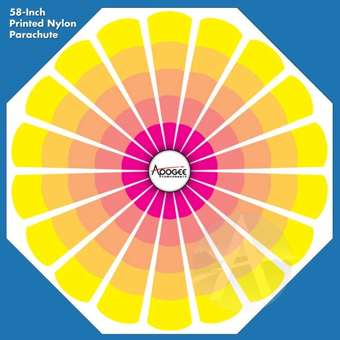 Tough rip-stop nylon cloth parachute with a highly visible printed pattern that adds some color to the rocket’s flight. It feels like silk and can be packed tighter to fit smaller diameter tubes. Octagon shape, the size is 58″ diameter as measured from flat edge to flat edge.