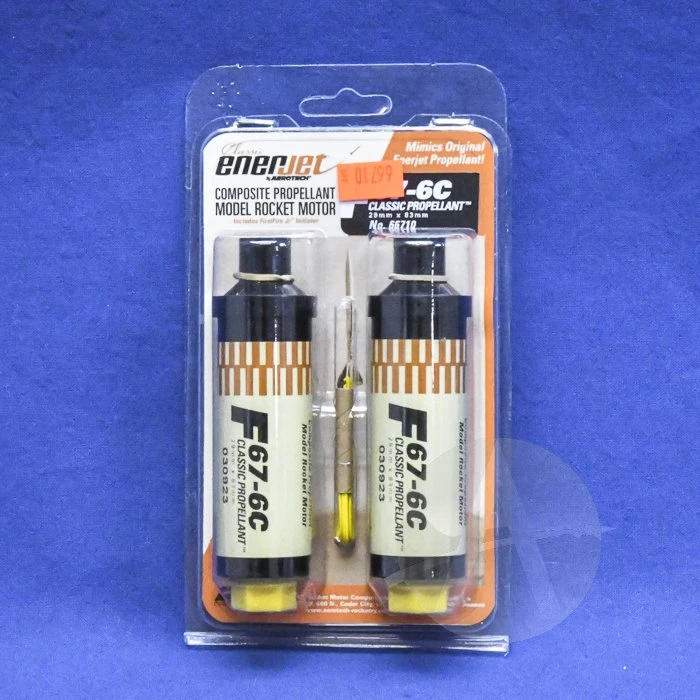 The F67C rocket motor is a true “Blast From the Past” as it mimics the look, sound and performance of the original Enerjet Propellant. The motor has a translucent exhaust plume studded with supersonic shock diamonds and no smoke, which appears to make your rocket leap off the launch pad.