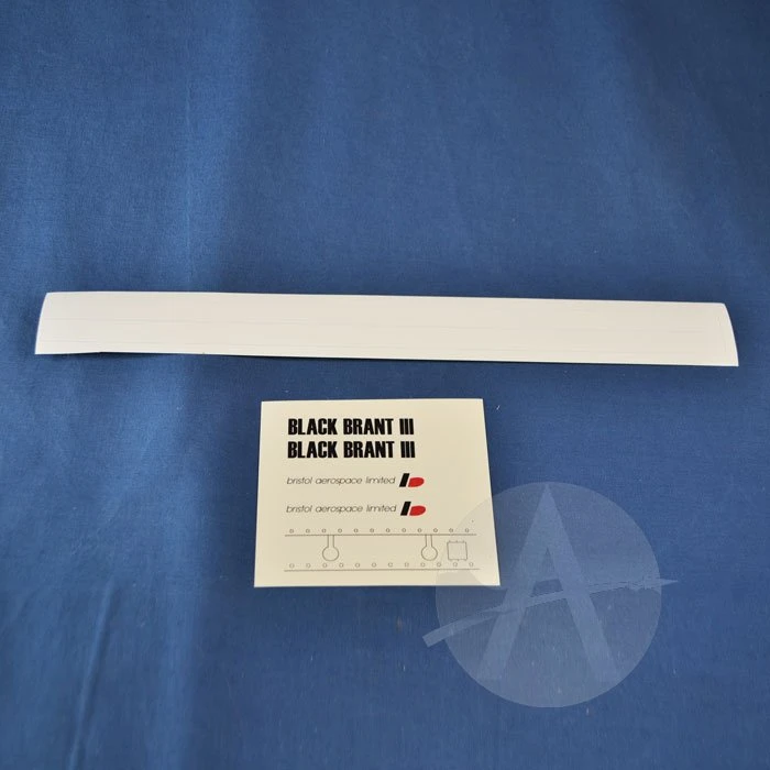 The real Black Brant III is a Canadian sounding rocket designed to launch small payloads of up to 39 pounds to around 72 miles high into the atmosphere. This single-stage scale kit is about 21.8 inches tall and features a 3D printed nose cone, laser-cut basswood fins, water-slide self-adhesive decals, and quick-change engine hook.