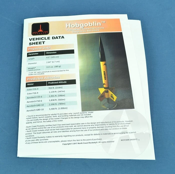 The Hobgoblin, reminiscent of a popular “D” powered kit from years ago, is designed to be an easy to assemble kit that flys to spectacular altitudes. It is capable of flying to altitudes over 3,300 feet on an Aerotech G80 motor. Features through-the-wall fins, and a thick-walled paper tube.