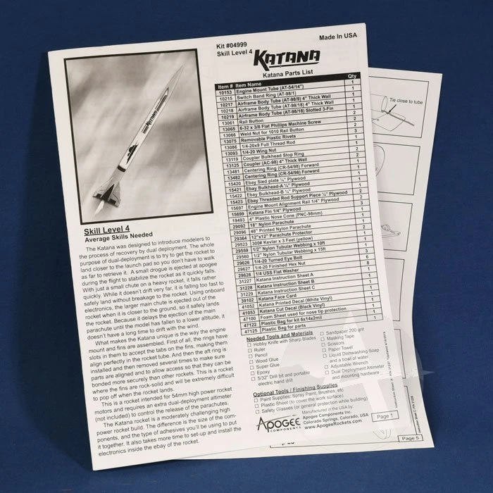 The Katana is a large 4-inch diameter rocket that is powered by 54mm diameter rocket motors. It is dual-deployment capable with the e-bay compartment included in the kit. Also includes 2 sheets of colorful vinyl decals.