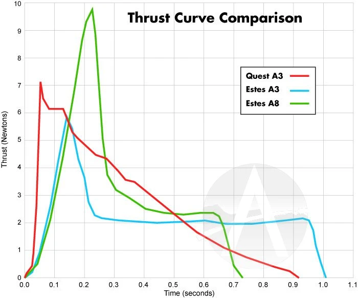 The Quest A3-4 rocket motor is for small light-weight rockets. It features composite propellant, which has twice the energy as a black powder motor. Same size and diameter as an Estes motor, so it fits all your favorite rockets. But this is for single-stage rockets only, as it cannot be staged.